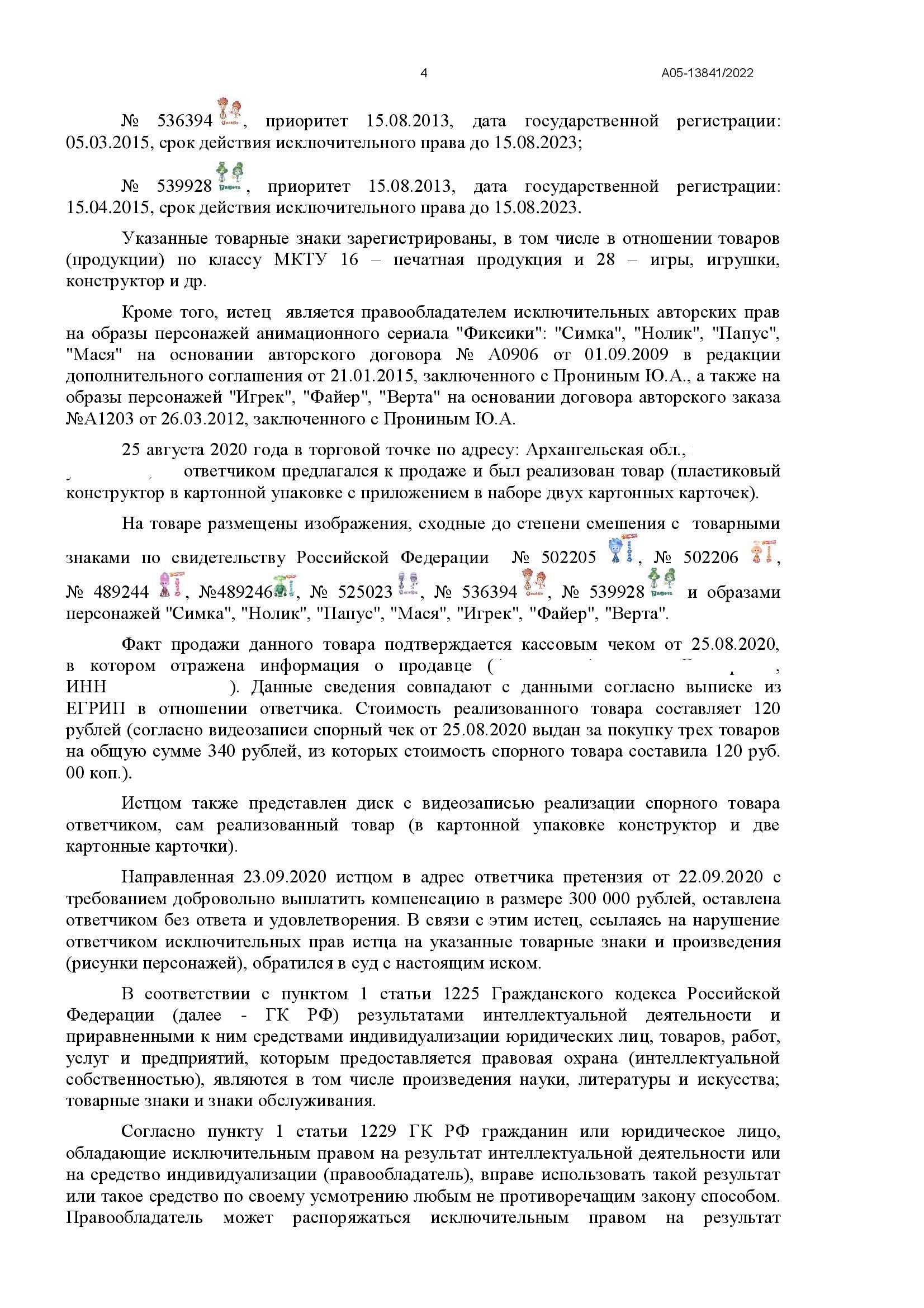 АО «Аэроплан» обратилась в Арбитражный суд г. Архангельска с иском к Индивидуальному предпринимателю с требованием о взыскании компенсации за нарушение исключительных прав на изображение произведения изобразительного искусства - героев мультфильма «Фиксики» в сумме 140 000 руб. Была произведена контрольная закупка пластикового конструктора в картонной упаковке на сумму 120 рублей.